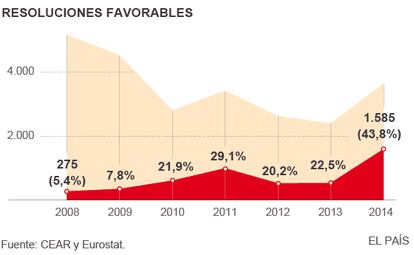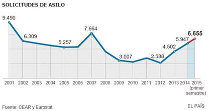 Las peticiones de protección internacional recibidas en España se han multiplicado en los últimos meses a raíz de la guerra de Siria: han pasado de las 2.588 de 2012 a las 5.947 de 2014, según CEAR. Aunque esta última cifra se ha quedado pequeña. El país contabilizó 6.655 solicitudes solo en primer semestre de 2015, según Eurostat. Además, a finales de junio, se le acumulaba el trabajo y todavía tenía pendientes de resolver más de 12.000 expedientes —el doble que en septiembre de 2014—.