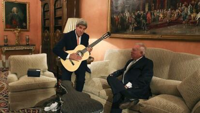 Kerry ha arrancado su agenda en Madrid esta tarde con una reunión con el ministro de Asuntos Exteriores y de Cooperación, José Manuel García-Margallo, para repasar los principales asuntos de las relaciones bilaterales y la situación internacional, en un encuentro en el que el ministro español le ha regalado una guitarra. "Es un regalo precioso", ha dicho Kerry. En ese momento, el ministro español le ha preguntado si "desearía cantar", ante lo que el secretario de Estado estadounidense ha respondido "no", entre risas.