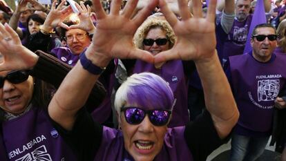 Alba Galán acaba de cumplir 18 años y ha llegado desde Valencia. En su pancarta se puede leer: “Quien ama no mata, ni humilla, ni maltrata”. Narra que alguna amiga le ha contado que el novio le riñe por la forma de vestir y que eso es un síntoma de violencia machista. “Trabajo en prevención y se podría hacer mucho más. Con recortes y sin ellos”, ha asegurado Ana Isabel Velázquez, una trabajadora social del sur de Madrid que se enfrenta diariamente a casos de mujeres maltratadas. Alfonsa Escobar es una madrileña de Vicálvaro. Tiene 78 años y aunque le cuesta andar, no ha querido perderse la marcha. “Tengo ocho nietas. Algunas han tenido que emigrar a Holanda porque, aunque tienen la misma formación que sus compañeros varones, a ellas les pagan menos o ni las contratan. Eso también es una forma de violencia de género”.