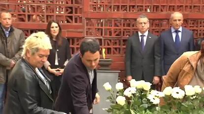 Tras su lectura, todos los asistentes han participado en una ofrenda floral ante un pebetero encendido. El presidente de Sortu, Hasier Arraiz, como han hecho todos los miembros de su grupo parlamentario y el resto de políticos, han ido depositando rosas, claveles y gerberas blancas sobre un macetero en recuerdo a las víctimas.