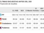 Todo es posible aún, pero la fotografía que ha hecho Metroscopia en su sondeo, cuya recogida de datos se realizó del 7 al 10 de diciembre, coloca a PP y PSOE en la primera línea con el 25,3% y el 21% de los votos, respectivamente, alejados de sus competidores. El PP obtendría entre 105 y 112 escaños, con un resultado final de 109, en tanto que el PSOE se mueve entre los 85 y los 94, con una media de 90. La imagen actual iguala a Podemos y Ciudadanos en 60 actas, aunque el partido de Pablo Iglesias sobrepasa en un punto al de Albert Rivera, con un 19,1%, frente al 18,2%. Podemos sube al tercer puesto después de haber estado relegado a la cuarta posición desde octubre.