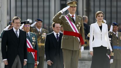 A la ceremonia en el Palacio Real asisten unos 150 invitados, en su mayoría mandos de los tres ejércitos y la Guardia Civil, así como el presidente del Gobierno en funciones, Mariano Rajoy, y los titulares de Defensa, Pedro Morenés, y de Interior, Jorge Fernández Díaz.