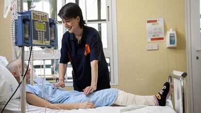 "No es lo que doy, es lo que me dan. Que te canten sus canciones favoritas, que te digan que no te vayas, o un 'me dejas que te dé un beso'. Te vas a casa con el corazón lleno de emoción", cuenta en una pausa Feijoó, informática de 41 años. Cada jueves, de cinco a ocho de la tarde, se mueve entre las habitaciones del centro como un policía de paisano por las calles vela por la seguridad: sin revelar a los padres de los niños que visita su condición de veterana para que su historia no les haga caer en la desesperanza.