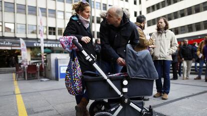 Con los bebés en los carritos, portando pancartas, megáfonos y copias de sus denuncias ocho parejas se han presentado este martes en la plaza de los Cubos de Madrid para demandar a la Seguridad Social y exigir permisos de paternidad intransferibles e iguales a los de maternidad —de 16 semanas—. "Hoy por hoy nosotras asumimos todo el coste de criar a los hijos y no es justo", protesta Marta Jiménez, de 34 años, que ha acudido a la plaza con su marido, Javier Jambrina, de 35, y su hija Abril, que nació hace apenas cinco meses.