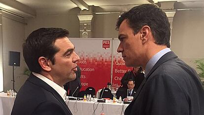 Pedro Sánchez busca aliados internacionales en su trabajo por convencer a Pablo Iglesias de que facilite su investidura. Y este jueves en Bruselas se empleó a fondo en esta misión. En la reunión previa al Consejo Europeo celebrada por los socialistas se contó por primera vez con la presencia del primer ministro griego, Alexis Tsipras, invitado como observador a este cónclave.