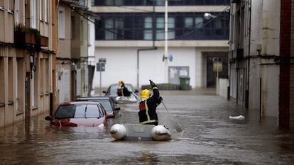 En zodiacs, piraguas, barcas. Varias familias de las localidades coruñesas de Sada y Carballo han tenido que ser evacuadas este miércoles por las inundaciones que sufren estas poblaciones a causa de las lluvias torrenciales que no cesan desde el lunes al atardecer. La alerta de nivel naranja decretada por la Xunta de Galicia se ha traducido, en la realidad, en unas consecuencias más graves de las esperadas, con una autopista cortada por un derrumbe y muchos viales engullidos por ríos desbordados. Los servicios de Emergencias también han rescatado a los tripulantes de un coche que quedó atrapado en una carretera, y los alumnos de un instituto se han quedado sin clase al anegarse el centro. Se hizo casi imposible acceder al edificio, rodeado y aislado por una extensa masa de agua.