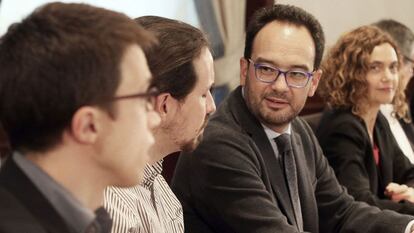 "Vamos a estudiar con detenimiento el documento de Podemos durante el fin de semana", ha indicado Hernando, que aspira a que la reunión a tres se repita el lunes de la próxima semana. Habrá que verlo, dado el rechazo que se prodigan Pablo Iglesias y Albert Rivera. Aun así, los portavoces del PSOE, Podemos y Ciudadanos abordarán el calendario esta mañana en el Congreso. "Deberíamos esforzarnos por encima de nuestras siglas para acabar con un gobierno que ha causado muchísimo sufrimiento", ha razonado Hernando, en alusión al Ejecutivo en funciones de Mariano Rajoy.
