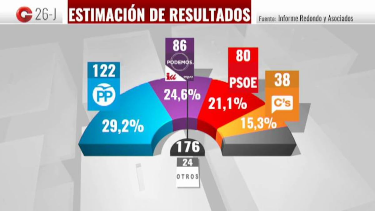 Sigma Dos, que ha hecho la encuesta para El Mundo, coincide en situar al PP como la fuerza que ganará de nuevo los comicios y le otorga un mejor resultado que en diciembre tanto en votos como en escaños —30,5% frente a 28,7% y entre 124 y 129 diputados frente a 123. Unidos Podemos se apuntará uno de cada cuatro votos (24,8%) y ocupará entre 86 y 92 escaños. El resultado de la formación de Pablo Iglesias irá en detrimento del PSOE, que pasa de los 90 diputados que obtuvo el 20-D —que ya fueron su peor resultado histórico— a entre 73 y 78 parlamentarios y un 20% de votos. La encuesta otorga a Ciudadanos un 14,1% frente al 13,9% que obtuvo el 20-D, a pesar de lo cual podría llegar a ver rebajados sus diputados de 40 a 35.