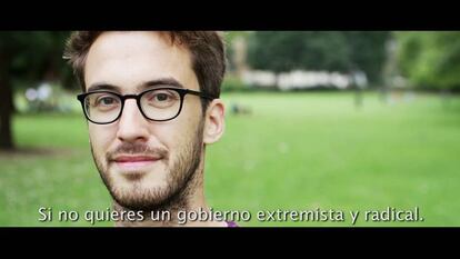 Un grupo de jóvenes aparece en el montaje mientras se destacan las políticas que defiende el PP como el "libre mercado", una "alianza contra el terrorismo", un "país seguro", una España "estable y fuerte en Europa".