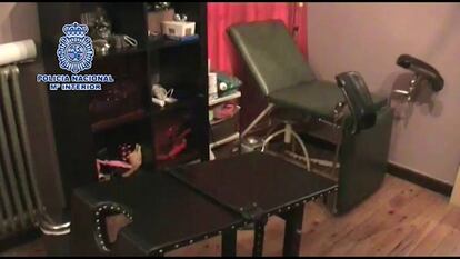 Los agentes que llegaron al piso especializado en el sadomasoquismo describen en qué encontraron en sus habitaciones: "Camilla ginecológica, potro de inmovilización, cepo con pie, jaula, columpios y suspensiones, electro-estimuladores, collares de sumisión, fustas, palas, floggers (látigo con flecos), mordazas, máscaras, culotes, corsés y corpiños, entre otros efectos".