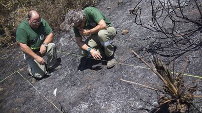 En lo que va de año, la provincia de Cádiz ha sufrido una treintena de incendios que han sido resueltos por este equipo de investigadores. “En esta profesión la experiencia es un grado. Acumulas información año tras año, incendio tras incendio”, explica Sánchez. “En esta zona, la mayoría de los fuegos son intencionados y algunos de ellos se repiten por las mismas fechas”, apunta el agente Alfonso Macías. Un paseo por los alrededores de Sierra Carbonera y Sierra del Arca deja en evidencia las cicatrices de estos incendios pasados: esqueletos de árboles calcinados, matorrales que se abren paso entre la sufrida tierra… Y ejemplo de ello también es el fuego registrado en la madrugada del miércoles en San Roque, también en la finca pública La Alcaidesa, donde el olor a quemado aún es intenso. “Desde hace tres o cuatro años se repite el fuego en esta zona. Siempre cuando cambia el viento a poniente y por el oeste de la finca. Esta vez, se han quemado 16,5 hectáreas, pero el año pasado fueron 100. Quien haya sido aprovechó que los medios de extinción estaban sofocando el fuego de La Línea, que se desalojaba a los vecinos… para venir aquí y con un mechero prender fuego”, explica Sánchez.