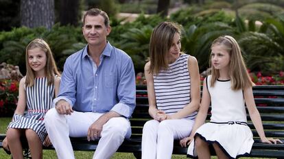 Los reyes Felipe y Letizia junto a sus hijas la princesa Leonor y la infanta Sofía han posado en los jardines del Palacio de Marivent, en la tradicional sesión fotográfica de la familia ante los medios de comunicación que cubren el verano real. El monarca ha mantenido la incógnita sobre si el candidato del PP, Mariano Rajoy, se presentará a la sesión de investidura y tampoco ha dado detalles sobre el contenido del despacho mantenido ayer con el presidente en funciones. "No hace falta entrar en temas políticos, ya iréis viendo cómo va" ha dicho el rey en respuesta a las preguntas de los periodistas que han asistido a retratar a la familia.