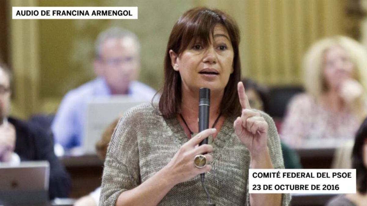 La intervención de Armengol fue una de las más críticas con el cambio en la posición política del PSOE. “[Rajoy] no tiene ni los votos ni los escaños. Le vamos a regalar escaños socialistas con votos que nos votaron para que quitáramos a Rajoy para hacerle presidente del Gobierno. Eso es una vergüenza. Es una traición a todos los ciudadanos y a los compromisos que hemos hecho. Por tanto, nos descalifica para ir a la gente a pedirle otra vez el voto. ¿Para hacer qué? ¿Para hacer lo contrario de lo que dijimos?”, fue una de sus reflexiones.