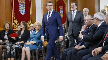 La confirmación oficial de los contactos para intentar aprobar los Presupuestos la realizó Rajoy tras presidir en Santiago el acto en el que Feijóo prometió el cargo de presidente de la Xunta por tercera vez. Como guardián de la única mayoría absoluta que le queda al PP en una comunidad autónoma, Feijóo censuró en su discurso las “líneas rojas arbitrarias” y la “insistencia en prejuicios que perjudican la gobernación del Estado”. “Galicia puede y quiere ser un modelo de estabilidad para España”, afirmó el presidente gallego dirigiéndose expresamente a Rajoy, de quien promete ser “un aliado fiel” tanto para impulsar reformas económicas como para defender la unidad de España. “El presidente de Galicia siempre estará ahí, nunca pedirá más de lo que le corresponde y nunca se conformará con menos de lo que le corresponde”, dijo.