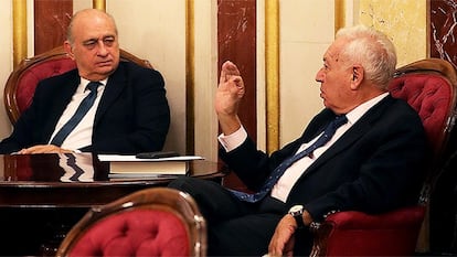 El Congreso aprobó hace un mes, con la única oposición del PP, la reprobación de Fernández por sus conversaciones con el antiguo responsable de la Agencia Antifraude de Cataluña para, supuestamente, buscar pruebas contra políticos independentistas. “Hemos tenido una actitud enormemente crítica con Jorge Fernández”, dijo este martes Hernando. “Nos ha parecido un pésimo ministro. Nosotros no vamos a votar a Jorge Fernández, pero tampoco vamos a presentar un candidato alternativo”, prosiguió, limitándose a calificar de “errónea” la decisión de los populares. En cualquier caso, el portavoz socialista aclaró: “Hay un acuerdo que nosotros vamos a respetar”.