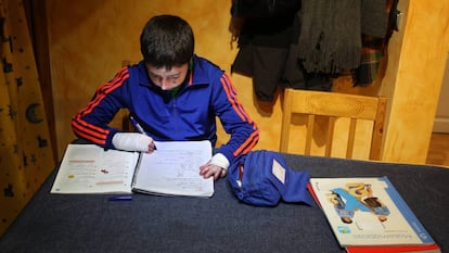 Alberto está matriculado en el quinto curso de un colegio público de integración de Alcalá de Henares, donde tiene asistencia sanitaria. Al salir del coche, de vuelta al pequeño chalé de la familia en Los Santos de la Humosa (Madrid), cojea apenas en la pierna derecha, algo que no le impide ponerse a jugar con una pelota nada más entrar en casa. “Hace todo lo que se propone”, relata la madre. Ese día tenía que hacer los deberes de matemáticas: un ejercicio de divisiones a tres cifras que acaba en pocos minutos. Liquidada la matemática, Alberto empieza a moverse con vivacidad en el salón: busca las consolas, habla de sus juegos, hace chistes, sube a su cuarto, baja, busca unos parches, coge la pelota y la deja, casi no para: ligero como una mariposa con la fibra de un marinero.
