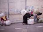 Mujeres y hombres acceden a los polígonos por separado. Son dos filas independientes que solo se cruzan en la pendiente marroquí. A las mujeres, algunas con bastón, les acompañan ciegos y personas con diferentes discapacidades, todos con bultos enormes a cuestas. Las veteranas están muy envejecidas por la dureza de su profesión. Cuando florecen las discusiones, los policías y guardias civiles se apoyan en los plantones, ciudadanos marroquíes que traducen sus órdenes.
