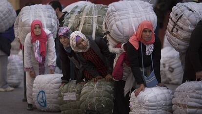 Cuando las primeras mujeres acceden a los polígonos, una cuadrilla de hombres las agarra de los brazos para acompañarlas a la carrera y convencerlas de que acepten el precio de esa mañana. Algunas forcejean suavemente antes de acceder a la nave. Allí la porteadora se inclina, un estibador sube el paquete a su espinazo y otro lo ata a toda velocidad a los hombros con cinta de celo. Sin embargo, a veces no hay acuerdo y la rueda se para. Los empresarios necesitan dar salida a la mercancía y solo cuando ellas abandonan los polígonos cargadas, entran las siguientes. En otras palabras, el precio sube hasta que las mujeres dan el sí. “Cuando el porte estaba a 30 euros sufría. Ahora ya no. La sonrisa la da el dinero que te llevas”, confía Ettan, que evita dar su apellido. El porteador Younes Regragui añade: "Cuando la gente no va, los empresarios suben el precio del bulto".