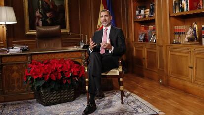 En su mensaje de Navidad, grabado en su despacho de La Zarzuela, el Rey puso buena parte del énfasis en “la necesidad” de cuidar y mejorar la “convivencia” en un tiempo en el que la crisis económica y la convulsión política han dejado profundas grietas en España. La convivencia, enfatizó, “exige respeto y consideración a los demás”. “A los mayores, entre hombres y mujeres, en los colegios, en el ámbito laboral (...) al entorno natural, a las ideas distintas a las nuestras”, afirmó Felipe VI, enumerando diversos ámbitos en los que se producen a diario abusos, intransigencia o fanatismo.