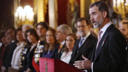 El Rey ha expresado este jueves el deseo de España de trabajar con la nueva Administración estadounidense, presidida por Donald Trump, "con el mismo nivel de excelencia" con el que lo ha hecho hasta ahora con Barack Obama, no solo a nivel bilateral, sino "también en los asuntos globales y los foros multilaterales". Las palabras del jefe del Estado, en la tradicional recepción al cuerpo diplomático extranjero acreditado en España, cobran especial significado ante la incertidumbre generada por el nuevo inquilino de la Casa Blanca, cuyos primeros pasos confirman su apuesta por el proteccionismo y el abandono de la búsqueda del consenso multilateral que caracterizó a la anterior Administración.