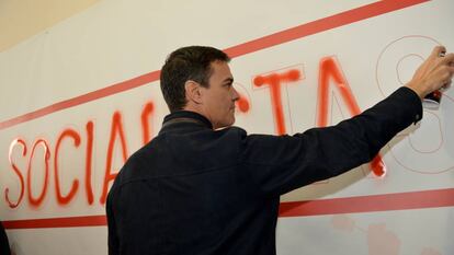 Por bulerías animaron al líder. Lo interrumpieron, lo aclamaron. Y aguardaron con más suspense que paciencia el mensaje por el que habían dormido poco y caminado mucho. "Dilo ya, dilo ya", le urgían. Y Sánchez lo dijo media hora después de haberse subido al púlpito: "Compañeros, compañeras, la militancia va a tener su candidatura. Es momento de comprometerse. Será un honor liderar vuestro proyecto político. Seré candidato a la secretaría general (...) En el mes de junio recuperaremos el Partido Socialista", sentenció Sánchez en la formalización de su candidatura. Lo considera secuestrado por la gestora, rehén de la abstención al PP y sustraído a la expresa voluntad de los militantes.