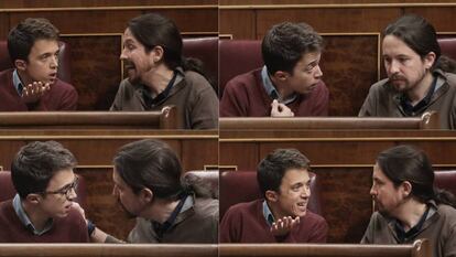 La escena en el escaño fue ilustrativa de lo dañada que está la relación entre el líder y su número dos. Iglesias y Errejón no se habían visto este martes hasta las tres de la tarde, cuando ambos tomaron asiento codo con codo en el Pleno del Congreso. La negociación de las últimas horas, no ya para buscar un acuerdo que evite su pugna con distintas listas en el congreso —algo que en ambos sectores se da ya por imposible— sino para alcanzar un pacto de mínimos sobre el órgano de garantías, había embarrado de nuevo todo. El sector de Errejón había acusado por la mañana al de Iglesias de perpetrar un “golpe de Estado burocrático”. Nada más ver aparecer a su número dos, Iglesias explotó, a la vista de todo el mundo.