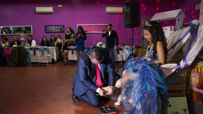 La nave donde aparca la desubicada limusina de los Zapata está rodeada de desguaces. Un almacén de azulejos, una fábrica de tacómetros. Calles mal asfaltadas y completa oscuridad. Tras una anodina puerta de hojalata corrugada, un montón de trastos y dos chicas congeladas que fuman vestidas de gala. Otra puerta metálica y detrás, un mundo paralelo de luz, color y sacarosa con un punto desangelado. Un trono envuelto en tul, flores de plástico, dos tartas (una gigante de mentira, otra deliciosa, de verdad), globos, la maqueta de un castillo, palomitas de maíz. En una esquina, la señora Luz, ecuatoriana, tiene un carrito de bebé lleno de dulces latinos –chupeticos, Frunas, caramelos de leche miel–, en la otra, el dj pincha bachata, cumbia, reggaetón. Del centenar de invitados (mitad adolescentes, mitad adultos), solo media docena son españoles. Como Luis, tío de la niña, que va en vaqueros. “Es todo un poco excesivo, pero hay que respetar”, dice. La fiesta tiene sus hitos: el vals, los discursos... La madre pinta los labios de la niña de rojo, el padre le quita las chanclas para calzarle unas sandalias de tacón plateadas. Sin embargo, lo importante de la fiesta no parece tanto el arcaico rito de iniciación (padres y adolescentes afirman que con 15 las niñas siguen siendo niñas), ni los roles de género tan marcados. Lo que aquí se celebra es el apego a la comunidad.