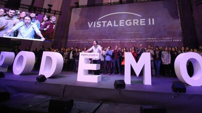 “¡El viento del cambio sigue soplando!”, brama Iglesias, y la grada se cimbrea ante el llamamiento del líder. “¡Sí se puede! ¡Sí se puede!”, responden los 8.000 simpatizantes de Podemos, que le muestran su apoyo enseñando las palmas de las manos, el símbolo que distingue a su propuesta. “¡Presidente, presidente!”, le dicen a Iglesias.