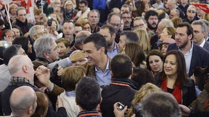 "Para unir al PSOE, lo primero que tenemos que hacer es separarnos del PP y que la militancia sea escuchada, y eso será cuando vote", ha clamado Sánchez ante alrededor de 1.800 personas en la Plaza del Milenio (el aforo contempla 1.200 sentadas y hasta 2.500 de pie, según la página web municipal). Al acto han asistido entre otros Luis Tudanca, secretario general de Castilla y León; Demetrio Madrid, expresidente autonómico; la senadora María Luisa Carcedo; diputadas como Adriana Lastra, Mari Luz Seijo o José Luis Ábalos, secretario general de la provincia de Valencia y miembro de la dirección del grupo parlamentario en el Congreso; y Santos Cerdán, secretario de Organización de Navarra. También estaba Iratxe García, que renunció a seguir como portavoz de la delegación del PSOE en el Parlamento Europeo tras la renuncia de Sánchez en el tormentoso comité federal del 1 de octubre. “Gracias a ti, Pedro, muchos hoy encontramos la razón para seguir creyendo en el PSOE”, le ha ensalzado.