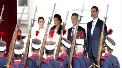 Mauricio Macri empieza a recibir el espaldarazo político que ha venido a buscar a España. Ahora falta la parte más importante del viaje de cuatro días que ha iniciado este miércoles: lograr inversiones de las empresas españolas. El presidente argentino fue recibido con todos los honores del nuevo protocolo de la Casa Real que se inaugura con él y que incluye un desfile militar a su llegada al Palacio Real, algo que no se había hecho nunca en una visita de Estado. Después, fue agasajado también por todo lo alto en el Congreso de los Diputados, donde lanzó su primer mensaje político de la visita en un breve discurso, que a algunos diputados les pareció con poco contenido político: "Hace 14 meses, Argentina comenzó un cambio histórico. Queremos llegar a pobreza cero, porque un tercio de los argentinos aún viven en la pobreza y eso es inaceptable, acabar con el narcotráfico y unir a los argentinos, esos son nuestros tres objetivos".