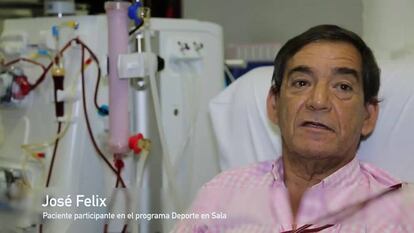 En el centro Los Lauros, en Majadahonda (Madrid), José Félix Herrer es uno de los pioneros. Después de conectarse a la máquina de diálisis, una vez que las variables que esta mide se estabilizan, inicia su ejercicio en el pedalín (como su nombre indica, un juego de pedales estáticos que se mueven sentado en el sillón). “Ya ha debido de llegar más allá de Guadarrama con los kilómetros que ha hecho”, bromea la especialista en deporte.