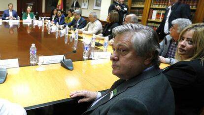 El padre de Leopoldo López, político venezolano encarcelado desde hace más de tres años en la prisión de Ramo Verde, ha criticado este jueves que Podemos y ERC impidieran que el Congreso aprobara una declaración sobre la “grave situación” en Venezuela. "La única excusa que tiene una actitud así es que hay una ignorancia total sobre lo que sufre Venezuela", ha dicho López, que ha acudido al Congreso junto con representantes de partidos y asociaciones de la oposición venezolana para reunirse con Albert Rivera, líder de Ciudadanos. Uno de los asistentes ha posado luego con una bandera de Venezuela en el escaño de Pablo Iglesias.