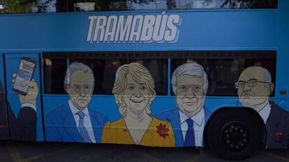 Podemos puso a circular este lunes en Madrid un autobús azul decorado con retratos de políticos, empresarios y periodistas. Pretendían denunciar lo que esta formación política llama la trama, y recibieron de inmediato duras críticas del PSOE, del PP y de Ciudadanos, con calificativos como “repugnante”, “impresentable” y “antidemocrático”. A bordo del vehículo —bautizado como Tramabús— iban Pablo Iglesias y la portavoz parlamentaria del partido, Irene Montero. Su recorrido incluyó la sede nacional del PP y las de importantes bancos y empresas.