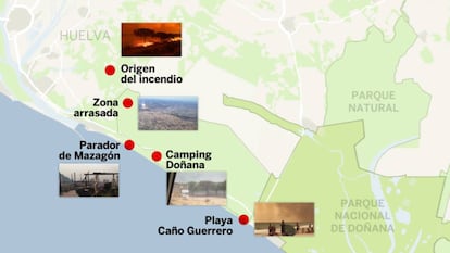 Un reguero enorme de pinos quemados recorre la carretera que une los municipios onubenses de Mazagón y Matalascañas. A un lado está el mar; al otro, el parque natural de Doñana. Este rastro negro (a ambos lados de la carretera) es la marca que ha dejado el gran incendio forestal que desde el sábado por la noche tiene en jaque a los servicios de extinción de Andalucía y del Ejecutivo central. Un millar de personas permanecen desalojadas de sus hogares.