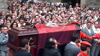 La figura de Miguel Ángel Blanco se ha quedado en la intimidad de las casas. Su recuerdo solo es visible en las banderas a media asta que ondean en la Casa Consistorial y en los carteles colocados en edificios públicos anunciando la exposición del asesinato de Miguel Ángel Blanco y de la movilización ciudadana por la libertad. En las paredes de las calles hay más carteles, muchos más, que denuncian el “aislamiento” que sufre en la cárcel Aintzane Delgado, histórica dirigente del comando Madrid, detenida en 2000. Ermua está dividida, como el resto de la sociedad vasca, entre quienes quieren pasar página y quienes quieren recordar a las víctimas del terrorismo. “A mí me cuesta hablar de aquello. Fue muy triste, pero ha pasado mucho tiempo...”, afirma con resignación Mari Carmen, una jubilada que estuvo entre los miles de manifestantes que encarnaron el conocido como espíritu de Ermua.