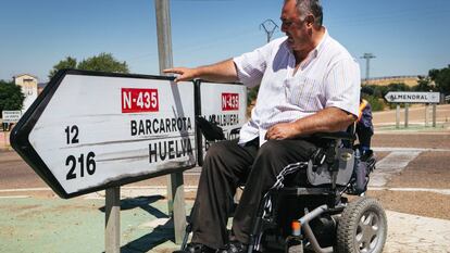 Rafael Fernández enciende su silla de ruedas eléctrica y atraviesa la N-435. De su accidente solo recuerda la imagen de la caja del camión que estaba pasando cuando hizo el stop. "Me contaron que salí despedido por la luna trasera", narra, como prólogo de los once meses que estuvo, tras despertar del coma, en el hospital de parapléjicos de Toledo. "Casi un año separado de mis hijos, luchando por sobrevivir", rememora, antes de exclamar con crudeza: "Y, 11 años después, este cruce sigue exáctamente igual que cuando me jodieron la vida".