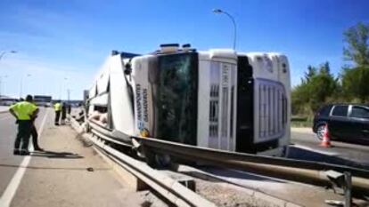 El camión ha volcado a las 10.00 al parecer por un "exceso de velocidad", según fuentes de la Subdelegación del Gobierno citadas por Efe. Circulaba por la carretera SO-20. El vehículo ha volcado sobre su lado derecho y ha terminado impactando contra un quitamiedos. El conductor ha resultado ileso.