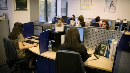 Es mediodía y el teléfono no deja de sonar. En la oficina del 016, cuya sede se ubica en Madrid con soporte para toda España, sus operadoras atienden sin cesar a quienes recurren a ellas buscando asesoramiento contra la violencia de género. El mayor volumen de llamadas se recibe precisamente en la franja horaria de las 12 a las 13 horas, como indica el último informe del Ministerio de Sanidad, Servicios Sociales e Igualdad, con datos de 2015. Sus trabajadoras informan a mujeres, parientes u otros allegados de los recursos contra la violencia machista, y, ante emergencias en curso, han de informar directamente al número 112. "Cada vez recibimos más llamadas de la ciudadanía, de vecinos, de 'he oído una pelea, no sé cómo puedo actuar'. Y nos encontramos con que ahora también llaman los profesionales: médicos, abogados, profesores...", revela Susana, responsable de la oficina del 016 que, por confidencialidad, no revela su apellido. Este es uno de los principales cambios que ha sufrido el servicio, que este martes cumple 10 años.