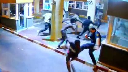 Las imágenes grabadas por las cámaras de seguridad del puesto fronterizo de El Tarajal, en Ceuta, recogen la entrada a la carrera en la madrugada de este lunes de cerca de 200 inmigrantes. En el vídeo se ve cómo, cerca de las cinco menos diez, un grupo de personas comienza a agolparse junto a una de las puertas de la frontera, que permanece cerrada, y como los policías destinados en el puesto van y vienen a la carrera. En un momento dado, uno de los inmigrantes salta la verja e, instantes después, un grupo numeroso consigue abrir la puerta pese a la oposición de los agentes y entrar a la carrera.