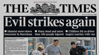 The Times. El mal golpea de nuevo, titula otra de las cabeceras británicas de referencia. Los islamistas asesinan a inocentes en Barcelona, destaca el diario en su edición impresa.