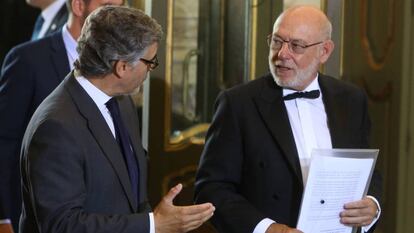 El presidente del alto tribunal y del Consejo General del Poder Judicial, Carlos Lesmes, ha ahondado en esta idea en su intervención: “Las voluntades unilaterales que pretenden disponer de la Constitución y que solo contemplan como mecanismo de preservación de lo que considera más propio la ruptura o la separación son inaceptables y violentan la propia democracia”. Y ha lanzado, sin citarlos, un mensaje tranquilizador a los ciudadanos catalanes: “Nadie sufrirá por cumplir la Ley”. Se trata de una referencia inequívoca a la advertencia lanzada por el diputado de Junts pel Sí Lluís Llach, que se sancionaría a los funcionarios que desacaten las leyes de secesión. "Muchos de ellos sufrirán" si cumplen la legalidad del Estado, amenazó el autor de L'Estaca.
