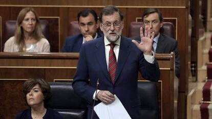 La discusión sobre la crisis catalana no se ha agotado tras las preguntas a Rajoy, que el PSOE ha centrado esta semana en las medidas del Gobierno para los parados de larga duración para los mayores de 55 años y Podemos en la recuperación del dinero para el rescate de la banca. Con Cataluña como telón de fondo, la vicepresidenta del Gobierno, Soraya Sáenz de Santamaría, ha entablado un forcejeo dialéctico con el diputado del grupo confederal Unidos Podemos Xavier Domènch y con el de Esquerra Republicana (ERC) Gabriel Rufián.