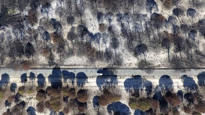 Más de dos meses después, a ras de suelo, las ramas de los matorrales todavía tiznan los bajos del pantalón al rozarlas. A vista de dron, a más de 100 metros de altura, el negro de las copas de los pinos calcinados se une al azul del horizonte. Lo que es negro ahora debería ser del verde intenso que dominaba el paisaje en Doñana.