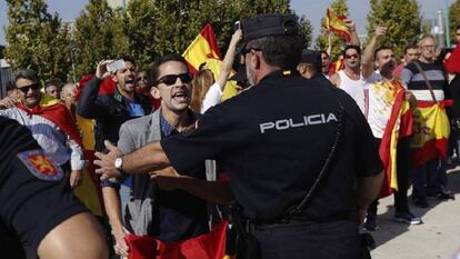 Radicales con banderas españolas asedian la asamblea de Podemos en Zaragoza