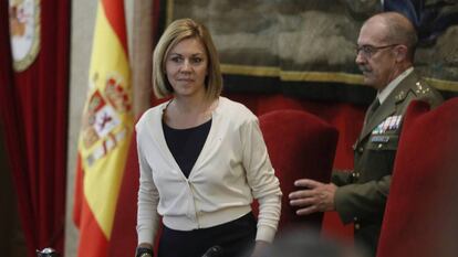 Su condición de ministra de Defensa ha obligado a Cospedal a mantener un perfil bajo en la crisis catalana, pero no ha querido estar totalmente ausente del debate en un momento de máxima tensión política y ha aprovechado su discurso en la clausura de un seminario sobre la participación de la mujer en la vida profesional, en el Centro Superior de Estudios de la Defensa Nacional (Ceseden), para colar un par de alusiones, alguna improvisada sobre la marcha, al conflicto con la Generalitat.