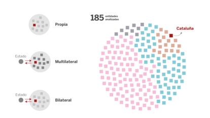 Cómo leer los gráficos. La infografía inferior clasifica las entidades territoriales en los niveles determinados por el estudio. En cuanto a los impuestos sobre el territorio propio, Cataluña aparece en dicho segundo grupo, en el que se incluyen 36 entidades y que conlleva cierta potestad. No es el conjunto más numeroso, pues el nivel que supone menor potestad sobre estos gravámenes incluye 82 entidades, entre las que se incluye Gales.