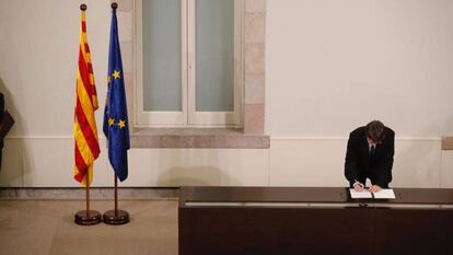Media hora después, Junts pel Sí y la CUP escenificaron su voluntad de llegar hasta el final pese a la fractura que había dejado la intervención de Puigdemont, y los 72 diputados independentistas firmaron lo que sí era una declaración de independencia y que tenía que haber leído el president. Tras ese acto, con toques de solemnidad pero sin validez jurídica, los anticapitalistas advirtieron de que había quedado “tocada” la relación de confianza con Puigdemont, al que dieron un mes de plazo para culminar la supuesta mediación internacional que él había esgrimido para suspender la declaración de independencia.
