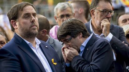 Las voces que sí se hacen escuchar desde la Generalitat son las que llaman a Puigdemont a no retroceder. “La república no es solo una opción, es una absoluta necesidad de supervivencia”, dijo el consejero de Relaciones Institucionales, Raül Romeva. En un inflamado discurso durante un homenaje a víctimas del franquismo, Romeva buscó todo tipo de paralelismos entre la situación actual y el totalitarismo. “No permitiremos dejarnos arrastrar de nuevo hacia una arbitrariedad, por mucho que algunos la quieran esconder, disfrazar, camuflar o maquillar de legalidad. Ni lo permitiremos, ni permitiremos que nadie lo avale, de ninguna manera”, dijo al tiempo que aseguraba que el autoritarismo de otras épocas continúa latente.