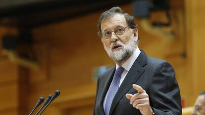 "En Cataluña se ha pretendido ignorar las leyes, desconocerlas, derogarlas, incumplirlas, cualquier término vale. Se reconoce y se afirma que es así. Se ha aprobado una nueva legalidad sin competencia alguna para hacerlo", acusó. Resumió el reto al que se enfrenta, una situación a la que "un Gobierno no puede asistir impertérrito, como si aquí no hubiera pasado nada", de este modo lapidario: "Estamos ante un desafío de dimensiones inéditas en nuestra historia reciente". Al sintetizar las medidas que desea aplicar, empezó por el cese del president y del Gobierno catalán, un anuncio que desató aplausos en la bancada popular en un momento un poco hooligan, ante el silencio de los senadores socialistas y el resto del hemiciclo. Fue un gesto que independentistas, Unidos Podemos y PNV repudiaron severamente en sus intervenciones. Probablemente se lo recordarán toda la vida al PP.