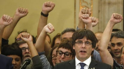 Más allá de las consecuencias políticas de la aplicación del artículo 155 de la Constitución, el desafío independentista catalán se ha llevado dos reveses en los últimos días: el sonoro portazo de la Unión Europea y la huida de empresas y bancos —que han puesto pies en polvorosa para evitar la incertidumbre— han convertido el relato secesionista en un cúmulo de malas noticias, que ayer tomaron forma de sainete vodevilesco. Con los partidos soberanistas preparando ya las elecciones del 21-D tras la aplicación del 155, Puigdemont y cinco de sus consejeros protagonizaron una espantada, una fuga, un traslado o un exilio —aún no está del todo claro— camino de Bruselas. El presidente catalán busca una salida en Bélgica: podría solicitar asilo político o intentar esbozar una estrategia de defensa destinada a dilatar al máximo un proceso judicial que se adivina largo y espinoso.